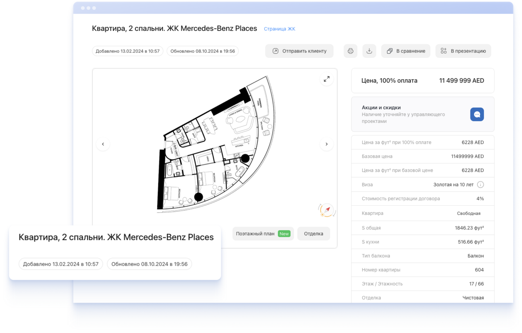 Создавайте подборки нескольких объектов по одной ссылке и добавляйте собственные комментарии. Отправляйте клиенту — при открытии вам придёт пуш-уведомление.