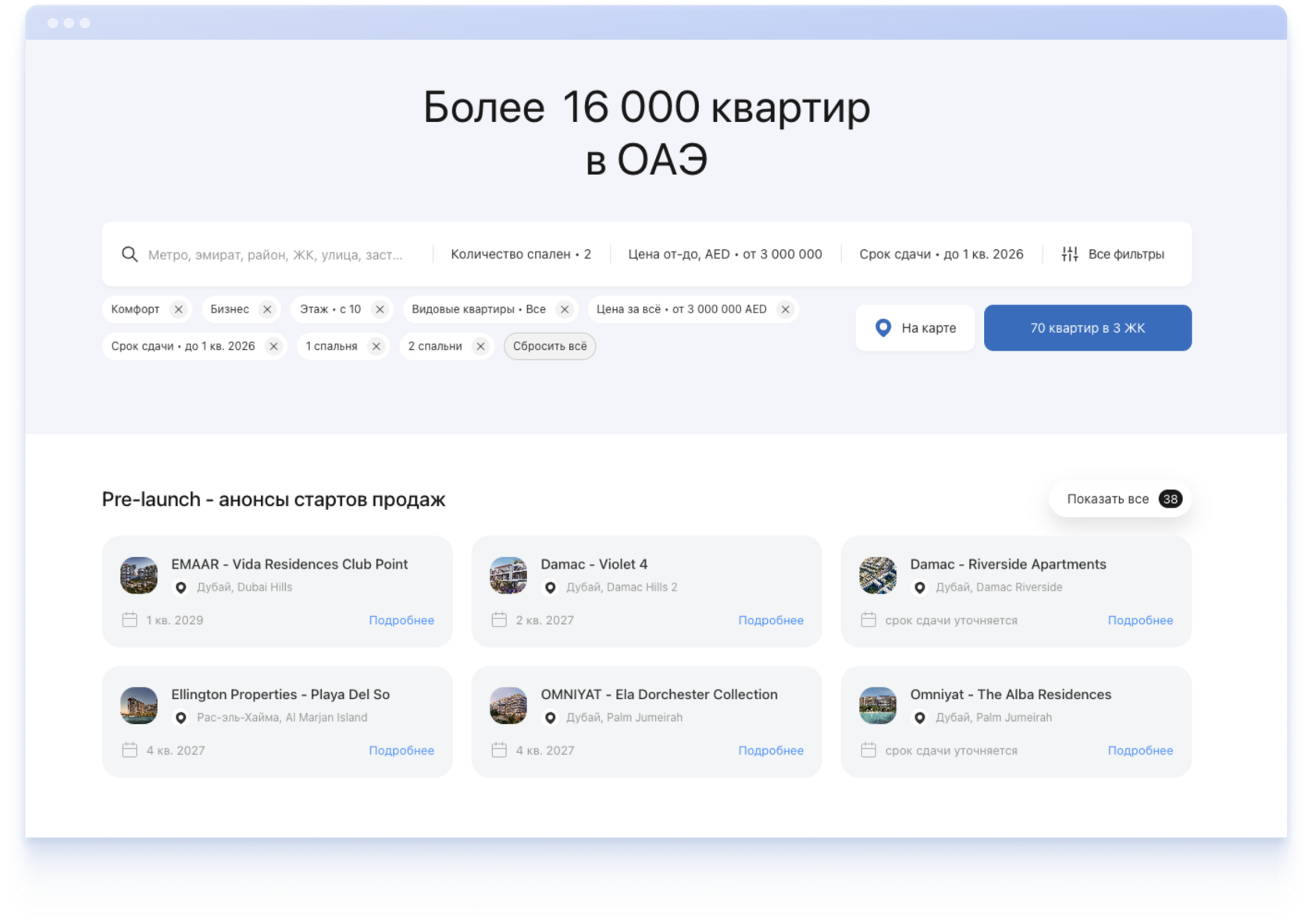 51 фильтр для подбора квартир по любым параметрам. Удобная выдача: на карте, списком квартир и комплексов.